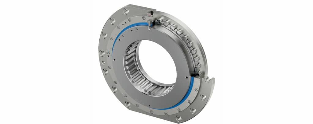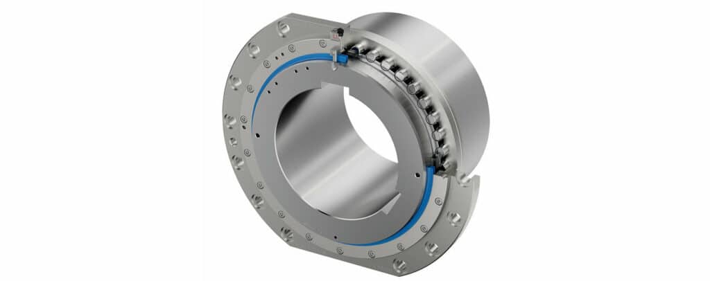The new development exhibits an increase in capacity, accompanied by significantly improved operating security and also meets with customers demands for higher capacities smaller weights and installation space. The connection dimensions ensure the possibility to replace its predecessor types.The transmission of force within the drum coupling takes place through positive locking. Hardened barrel rollers, placed in the holes formed by the two circular gearings, are used as force transmitting elements. The barrel rollers are driven axially. The cover and housing, combined with the seals, prevent both the entry of foreign bodies and the leakage of lubricant. The torque is transmitted to the rope drum via the flattenings on the outer diameter of the coupling housing and via the friction between the coupling housing and the flanged wheel.